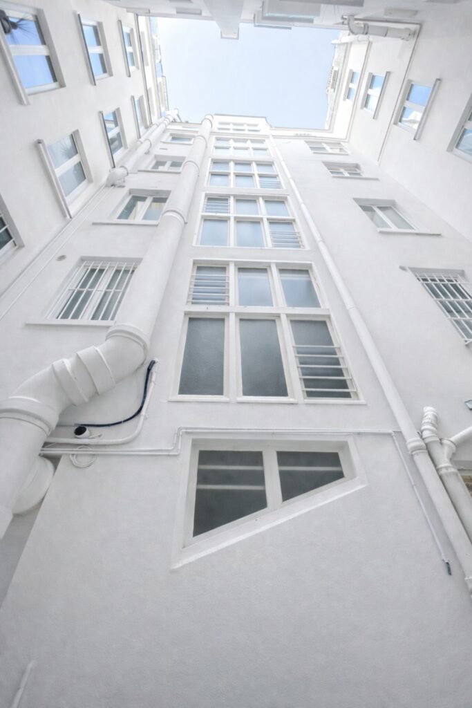 Rénovation énergétique des façades sur cour avec isolation par l’extérieur en fibre de bois et finition enduit à la chaux.