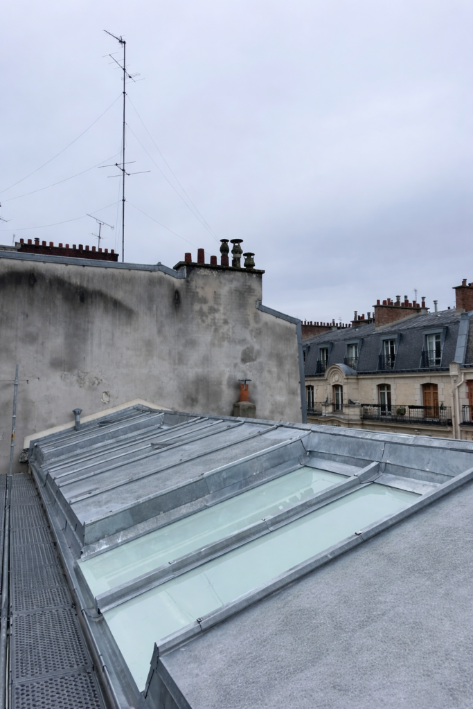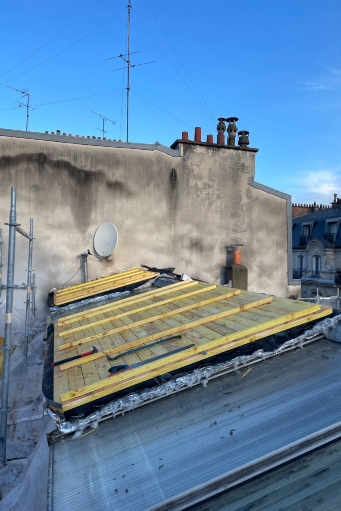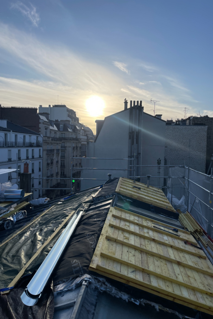 Réfection complète de la couverture en zinc d’un immeuble de logements, incluant une isolation thermique par l’extérieur.
